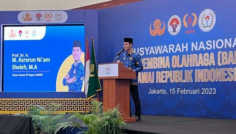 Jakarta: Deputi Bidang Pengembangan Pemuda Asrorun Ni’am Sholeh dikukuhkan menjadi Ketua Umum BAPOR KORPRI periode (2023-2028) dalam Musyawarah Nasional Badan Pembina Olahraga (BAPOR KORPRI) IX, Kamis (15/2). Asrorun Ni’am secara simbolis menerima bendera pataka dari Ketua Umum KORPRI Zudan Arif Fakhrulloh.