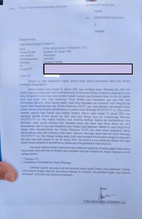 Dalam laporan polisi nomor SPTL/375/11/2025/SPKT/Polda Bali, Fiona menjelaskan bahwa bermula pada tanggal 8 Januari 2025, dirinya menerima pesan WhatsApp dari klien yang menyatakan bahwa perusahaannya mengoperasikan kapal tanpa izin dan izin operasionalnya telah habis.