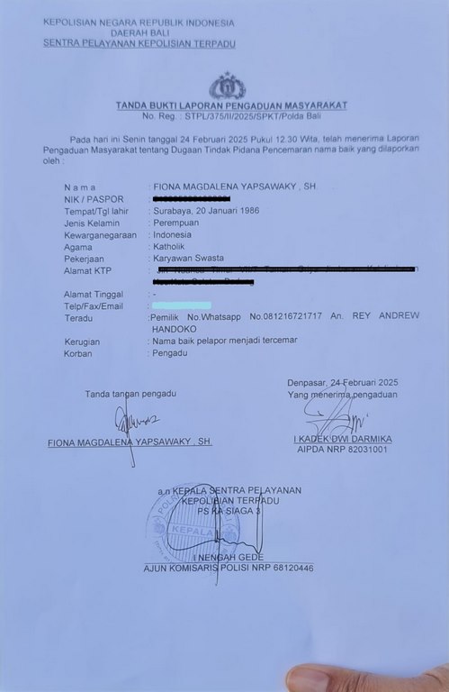 Merasa Dicemarkan Direktur PT Jatarim Laporkan RAH ke Polda Bali.