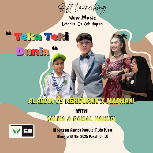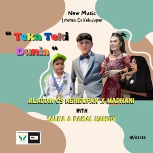 Jakarta, Minggu 18 Mei 2025. Seniman Aladdin CS Kehidupan dalam karya lagunya kali ini berjudul teka teki dunia. Yang menarik lagu terbarunya ini di bawakan bukan lagi secara solo namun mengandeng saudari madhani yang merupakan juara ajang beberapa kompetisi musik nasional dan para duta literasi distabilitas cs kehidupan yaitu adinda salwa yang merupakan tunanetra berprestasi dan ananda faisal hamudi yang merupakan tuna daksa hebat.