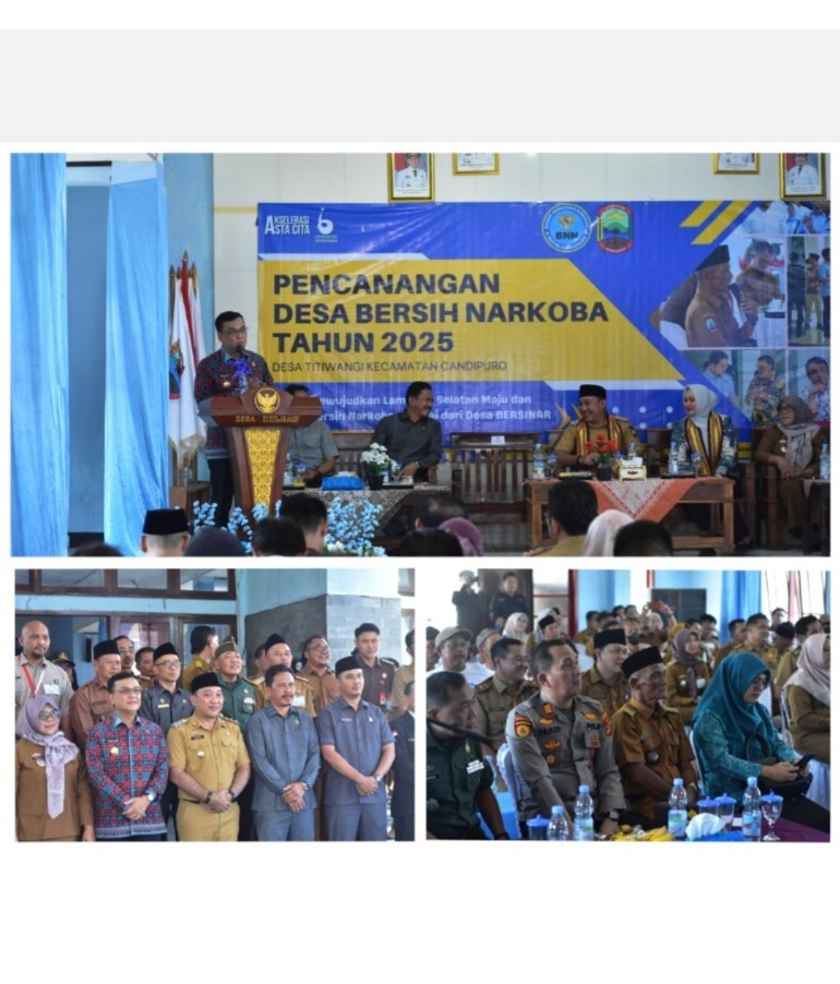 Lampung Selatan, bara-news.com \\  Dalam upaya serius memerangi penyalahgunaan dan peredaran gelap narkoba, Pemerintah Kabupaten Lampung Selatan melalui Wakil Bupati Saiful Anwar secara resmi mencanangkan Desa Bersinar (Bersih Narkoba) di Balai Desa Titiwangi, Kecamatan Candipuro. Kegiatan ini turut disaksikan dan didampingi oleh Kepala Badan Narkotika Nasional Kabupaten (BNNK) Lampung Selatan, AKBP Rahmad Hidayat, S.E., M.M.