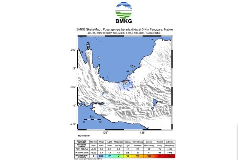 NABIRE, BARA NEWS — Gempa bumi tektonik bermagnitudo 2,8 mengguncang wilayah Kabupaten Nabire, Papua Tengah, pada Sabtu (26/7/2025) pagi. Getaran gempa dirasakan warga, meski berlangsung singkat dan tidak menyebabkan kerusakan infrastruktur. Badan Meteorologi, Klimatologi, dan Geofisika (BMKG) memastikan gempa tersebut berjenis dangkal akibat aktivitas sesar aktif di daratan.