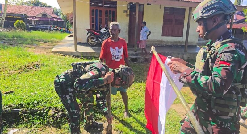 Maybrat, Papua Barat Daya — Dalam rangka memperingati Hari Ulang Tahun ke-80 Kemerdekaan Republik Indonesia, Satgas Pamtas RI-PNG Kewilayahan Yonif 763/SBA Pos Kumurkek melaksanakan kegiatan pembagian bendera Merah Putih kepada masyarakat di sekitar wilayah tugas. (7/8/2025)
