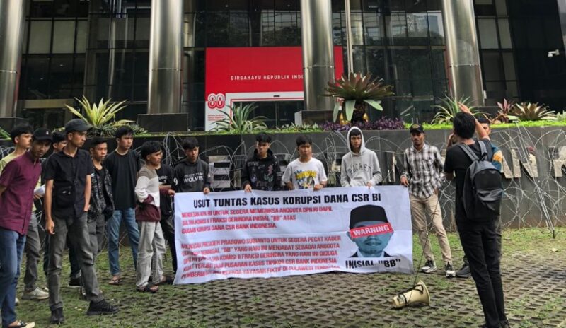 Jakarta — Puluhan mahasiswa menggelar aksi unjuk rasa di depan Gedung Komisi Pemberantasan Korupsi (KPK) RI, menuntut pengusutan tegas terhadap Bahtra Banong, anggota DPR RI, yang namanya disebut dalam daftar penerima aliran dana Corporate Social Responsibility (CSR) Bank Indonesia (BI) dan Otoritas Jasa Keuangan (OJK).