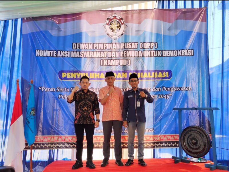 Kota Bandar Lampung, Dewan Pimpinan Pusat (DPP) Komite Aksi Masyarakat dan Pemuda untuk Demokrasi (KAMPUD) menggelar acara penyuluhan dan sosialisasi yang bertajuk, “peran serta masyarakat dalam pembangunan dan pengawasan pelayanan publik menuju Indonesia emas 2045”. Adapun acara tersebut dipusatkan di Kantor DPP KAMPUD di Jalan Pulau Tirtayasa, komplek ruko Griya Bukit Kencana, Kelurahan Campang Raya, Kecamatan Sukabumi, Kota Bandar Lampung pada Minggu (24/8/2025) sekira pukul 9.30 WIB sampai dengan selesai.