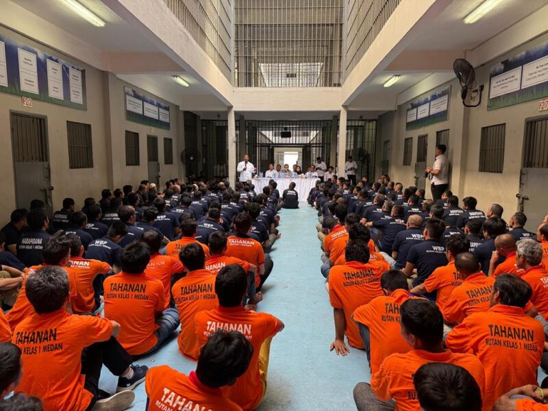Medan – Sebanyak 400 orang warga binaan Rumah Tahanan Negara (Rutan) Kelas I Medan berkumpul dalam blok untuk mengikuti kegiatan Penguatan Hak Asasi Manusia (HAM) yang diselenggarakan oleh Kanwil Kementerian HAM Sumatera Utara, dengan mengusung tema “pemenuhan hak warga binaan adalah Hak Asasi Manusia”. Selasa (26/08).
